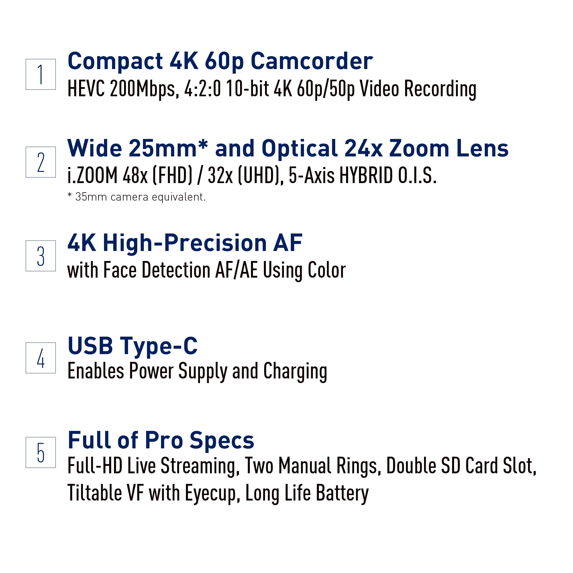 The Panasonic HC-X1600 is a professional camcorder designed for capturing high-quality 4K footage. Equipped with a 25mm wide-angle lens and a powerful 24x optical zoom, it provides excellent versatility for various shooting scenarios. Its lightweight and compact design makes it ideal for on-location shoots, events, sports, and vlogging. The 5-Axis Hybrid Optical Image Stabilisation ensures steady recordings, while the High-Precision autofocus delivers fast, reliable focusing for sharp images, making it an excellent choice for professionals.