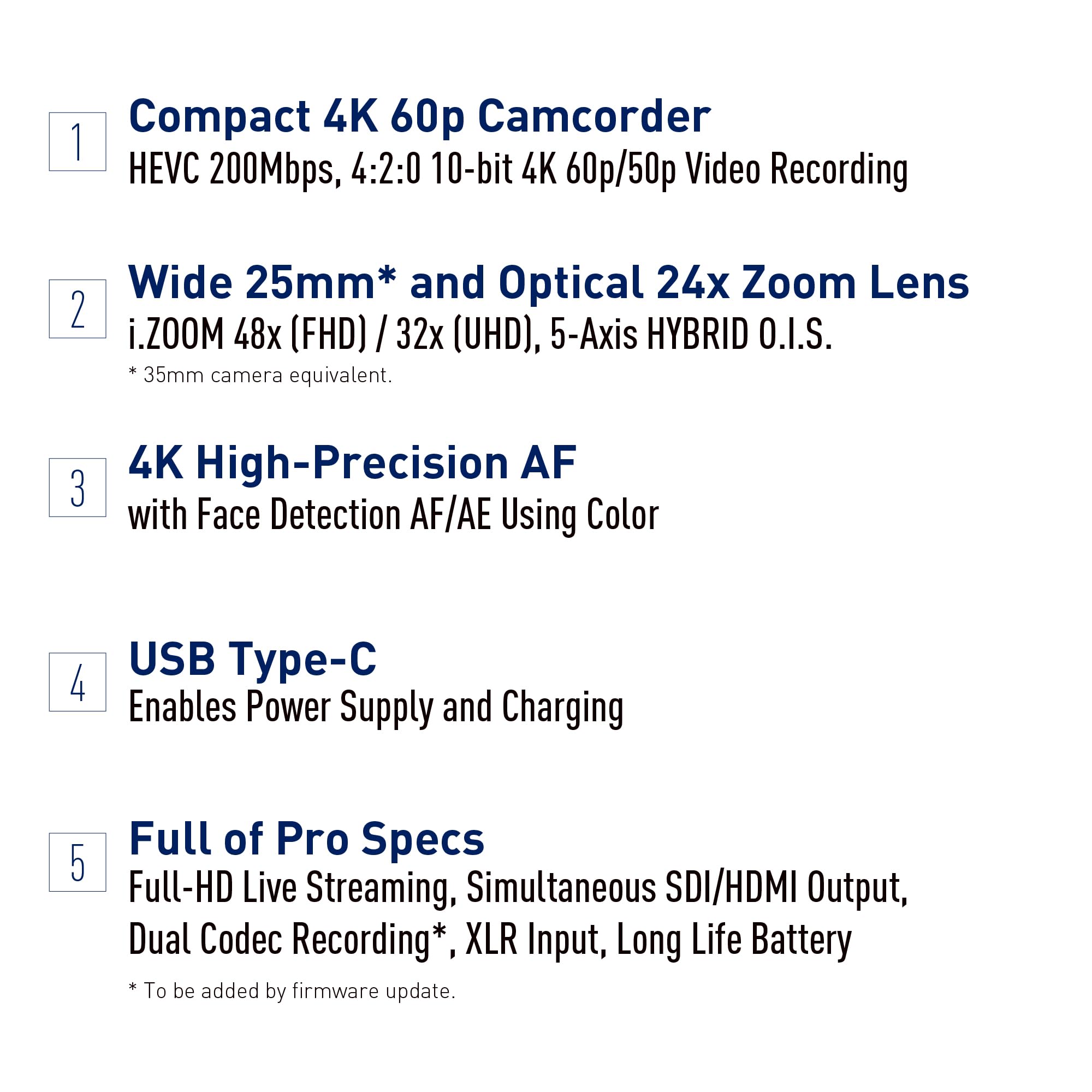 The Panasonic HC-X2100 is a versatile UHD 4K camcorder designed for professionals seeking high-quality video capture. With a 24x optical zoom lens, it allows for flexible framing while maintaining superb clarity. The camcorder features advanced optical image stabilisation to ensure steady shots, even in challenging environments. Its lightweight design makes it easy to carry on location shoots, and the robust build ensures reliability during prolonged use. Ideal for events, documentaries, and live streaming, the HC-X2100 is equipped to accommodate a range of filming needs.